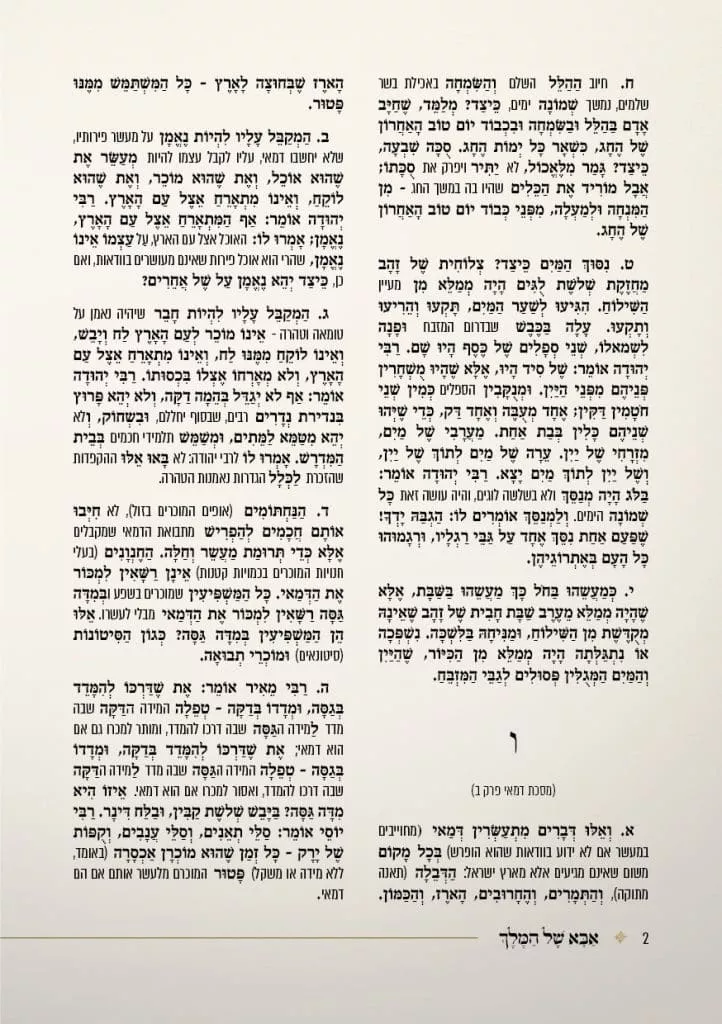 א. חָבִית משקה שֶׁנִּשְׁבְּרָה בשבת, אסרו חכמים לקלוט את כל תוכנה בכלים רבים, אלא מַצִּילִין הֵימֶנָּה (ממנה) כמות הנדרשת עבור מְזוֹן שָׁלֹשׁ סְעוּדוֹת, ותו לא. וְאוֹמֵר לַאֲחֵרִים: בּוֹאוּ וְהַצִּילוּ לָכֶם משקה לצורך שלשת סעודותיכם. וּבִלְבַד שֶׁיקלוט את המשקים באמצעות הכלים בלבד, ולּא יְסַפֵּג מהחבית בספוג ויטיף ממנו לכליו. דין נוסף: אֵין סוֹחֲטִין אֶת הַפֵּרוֹת לְהוֹצִיא מֵהֶן מַשְׁקִין; וְאף אִם יָצְאוּ מי הפירות מֵעַצְמָן – אֲסוּרִין בשתיה באותה שבת. רַבִּי יְהוּדָה אוֹמֵר: אִם היו אותם פירות מכונסים לְשם אכָלִין – הַמשקה היּוֹצֵא מֵהֶן מעצמו מֻתָּר בשתיה, וְרק אִם היו מכונסים מלכתחילה לְשם סחיטת המַּשְׁקִין שלהם – המשקה הַיּוֹצֵא מֵהֶן מעצמו אָסוּר בשתיה באותה שבת. חַלּוֹת דְּבַשׁ שֶׁרִסְּקָן מֵעֶרֶב שַׁבָּת, ועדיין לא נסחט מתוכם הדבש כולו, וְיָצְאוּ מֵעַצְמָן בשבת – אֲסוּרִים באכילה באותה שבת; וְרַבִּי אֶלְעָזָר מַתִּיר.