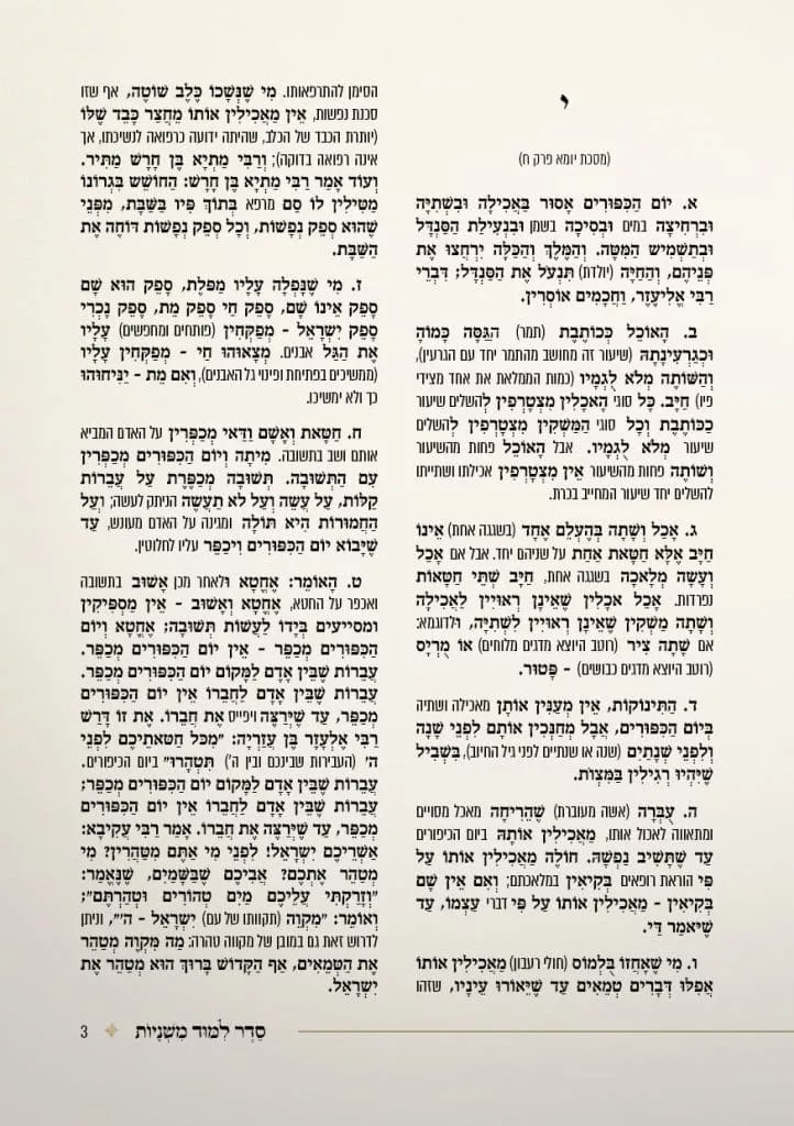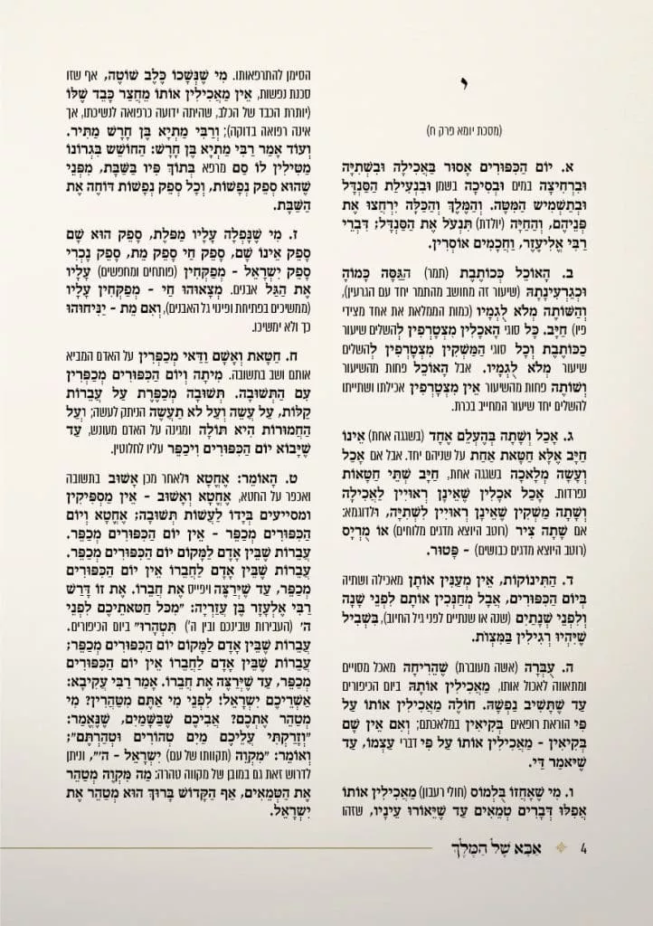א. יוֹם הַכִּפּוּרִים אָסוּר בַּאֲכִילָה וּבִשְׁתִיָּה וּבִרְחִיצָה במים וּבְסִיכָה בשמן וּבִנְעִילַת הַסַּנְדָּל וּבְתַשְׁמִיש הַמִּטָּה. וְהַמֶּלֶךְ וְהַכַּלָּה יִרְחֲצוּ אֶת פְּנֵיהֶם, וְהַחַיָּה (יולדת) תִּנְעֹל אֶת הַסַּנְדָּל; דִּבְרֵי רַבִּי אֱלִיעֶזֶר, וַחֲכָמִים אוֹסְרִין.