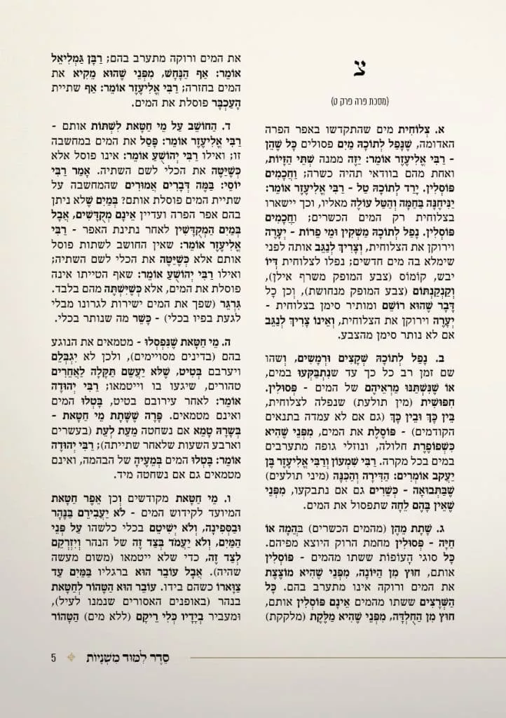 ד. הַחוֹשֵׁב עַל מֵי חַטָּאת לִשְׁתּוֹת אותם – רַבִּי אֱלִיעֶזֶר אוֹמֵר: פָּסַל את המים במחשבה זו; ואילו רַבִּי יְהוֹשֻׁעַ אוֹמֵר: אינו פוסל אלא כְּשֶׁיַּטֶּה את הכלי לשם השתיה. אָמַר רַבִּי יוֹסֵי: בַּמֶּה דְּבָרִים אֲמוּרִים שהמחשבה על שתיית המים פוסלת אותם? בְּמַיִם שֶׁלא ניתן בהם אפר הפרה ועדיין אֵינָם מְקֻדָּשִׁים, אֲבָל בְּמַיִם הַמְקֻדָּשִׁין לאחר נתינת האפר – רַבִּי אֱלִיעֶזֶר אוֹמֵר: שאין החושב לשתות פוסל אותם אלא כְּשֶׁיַּטֶּה את הכלי לשם השתיה; ואילו רַבִּי יְהוֹשֻׁעַ אוֹמֵר: שאף הטייתו אינה פוסלת את המים, אלא כְּשֶׁיִּשְׁתֶּה מהם בלבד. גִּרְגֵּר (שפך את המים ישירות לגרונו מבלי לגעת בפיו בכלי) – כָּשֵׁר מה שנותר בכלי.
