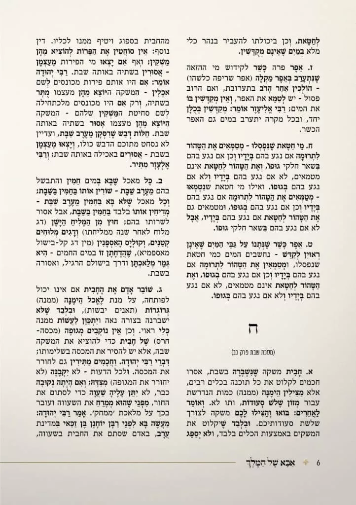 ו. סָכִין בשבת את הגוף בשמן וּמְמַשְׁמְשִׁין בזמן הסיכה בִּבְנֵי מֵעַיִם, אֲבָל לא מִתְעַמְּלִין ומשפשפים את הגוף בחוזקה, וְלא מִתְגָּרְדִין בכלי המיוחד לכך. אֵין יוֹרְדִין בשבת לְנהר קוֹרְדִּימָה שקרקעיתו בוצית ומחליקה, וְאֵין עוֹשִין אַפִּיקְטְוִיזִין (גורמים להקאת אוכל) על ידי שתיית סם המיוחד לכך, וְאֵין מְעַצְּבִין – מתקנים ומיישרים אֶת עצמות וחוליות התינוק הַקָּטָן לאחר יום לידתו, וְאֵין מַחֲזִירִין למקומו אֶת הַשֶּׁבֶר – עצם שנשברה. מִי שֶׁנִּפְרְקָה (יצאה ממקומה) יָדוֹ וְרַגְלוֹ – לא יִטְרְפֵם (ישטפם וישפשפם) בְּצוֹנֵן; אֲבָל רוֹחֵץ הוּא את ידיו ורגליו כְּדַרְכּוֹ במים צוננים, וְאִם נִתְרַפָּא – נִתְרַפָּא.