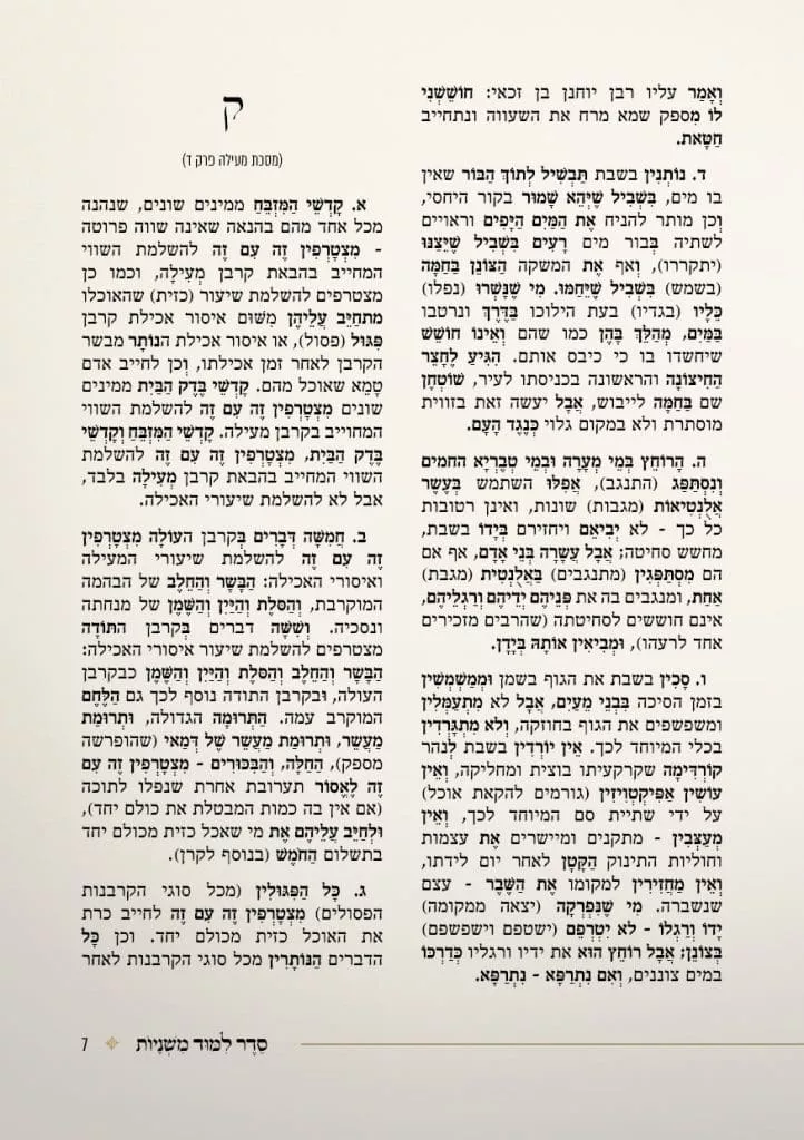 ג. כָּל הַפִּגּוּלִין (מכל סוגי הקרבנות הפסולים) מִצְטָרְפִין זֶה עִם זֶה לחייב כרת את האוכל כזית מכולם יחד. וכן כָּל הדברים הַנּוֹתָרִין מכל סוגי הקרבנות לאחר זמן אכילתם מִצְטָרְפִין זֶה עִם זֶה, וכָל הַנְּבֵלוֹת מכל סוגי הבהמות מִצְטָרְפוֹת זוֹ עִם זוֹ, וכָל סוגי הַשְּׁרָצִים מִצְטָרְפִין זֶה עִם זֶה לשיעור איסור האכילה. דַּם הַשֶּׁרֶץ וּבְשָרוֹ של אותו שרץ, מִצְטָרְפִין לשיעור (עדשה) המטמא. כְּלָל אָמַר רַבִּי יְהוֹשֻׁעַ: כָּל דבר שֶׁחומרת טֻּמְאָתוֹ וְשִׁעוּרוֹ המטמא שָׁוִין לרעהו – מִצְטָרְפִין אותם דברים זֶה עִם זֶה לשיעור המטמא; ואילו דבר שחומרת טֻמְאָתוֹ בלבד שווה לרעהו וְלא שִׁעוּרוֹ, או דבר ששִׁעוּרוֹ המטמא שווה לרעהו וְלא חומרת טֻמְאָתוֹ, וכל שכן דבר שאינו שווה לרעהו לא בחומרת טֻמְאָתוֹ וְלא בשִׁעוּרוֹ – אֵין מִצְטָרְפִין אותם דברים זֶה עִם זֶה לשיעור כלשהו.