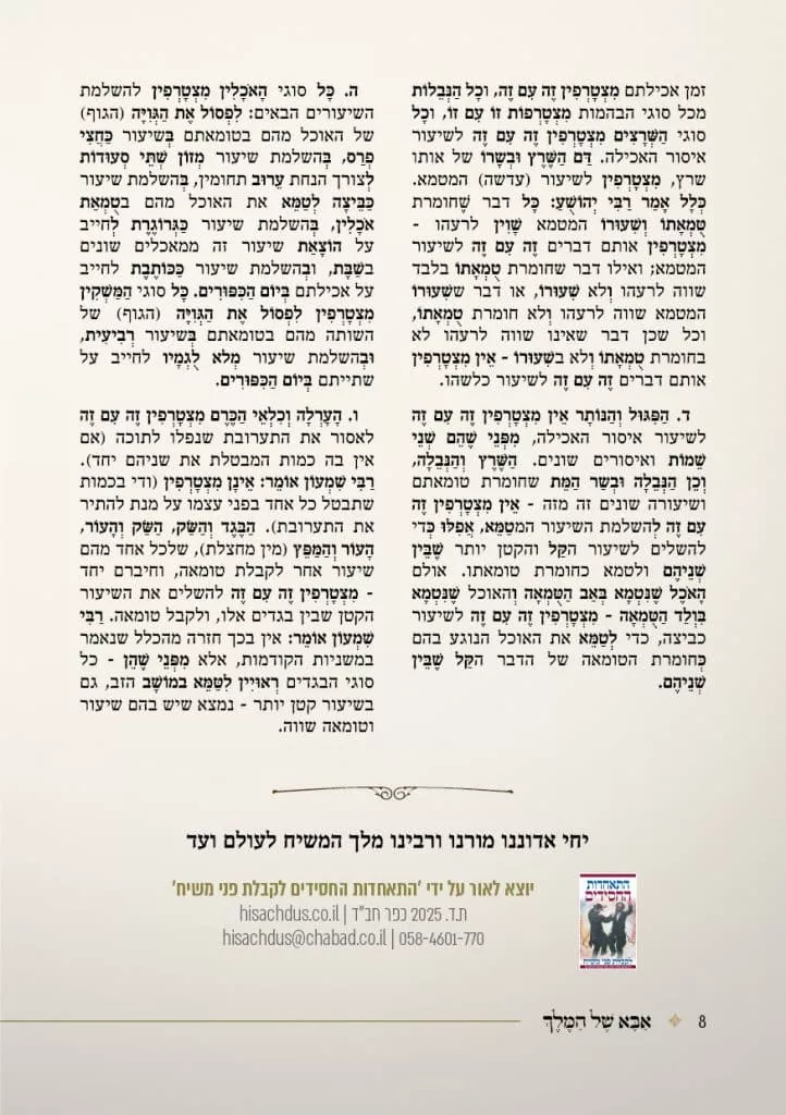 ה. כָּל סוגי הָאֹכָלִין מִצְטָרְפִין להשלמת השיעורים הבאים: לִפְסוֹל אֶת הַגְּוִיָּה (הגוף) של האוכל מהם בטומאתם בְּשיעור כַּחֲצִי פְרַס, בְּהשלמת שיעור מְזוֹן שְׁתֵּי סְעוּדוֹת לְצורך הנחת עֵרוּב תחומין, בְּהשלמת שיעור כַּבֵּיצָה לְטַמֵּא את האוכל מהם בטֻמְאַת אֹכָלִין, בְּהשלמת שיעור כַּגְּרוֹגֶרֶת לְחייב על הוֹצָאַת שיעור זה ממאכלים שונים בשַׁבָּת, ובְהשלמת שיעור כַּכּוֹתֶבֶת לחייב על אכילתם בְּיוֹם הַכִּפּוּרִים. כָּל סוגי הַמַּשְׁקִין מִצְטָרְפִין לִפְסוֹל אֶת הַגְּוִיָּה (הגוף) של השותה מהם בטומאתם בְּשיעור רְבִיעִית, וּבְהשלמת שיעור מְלא לֻגְמָיו לחייב על שתייתם בְּיוֹם הַכִּפּוּרִים.